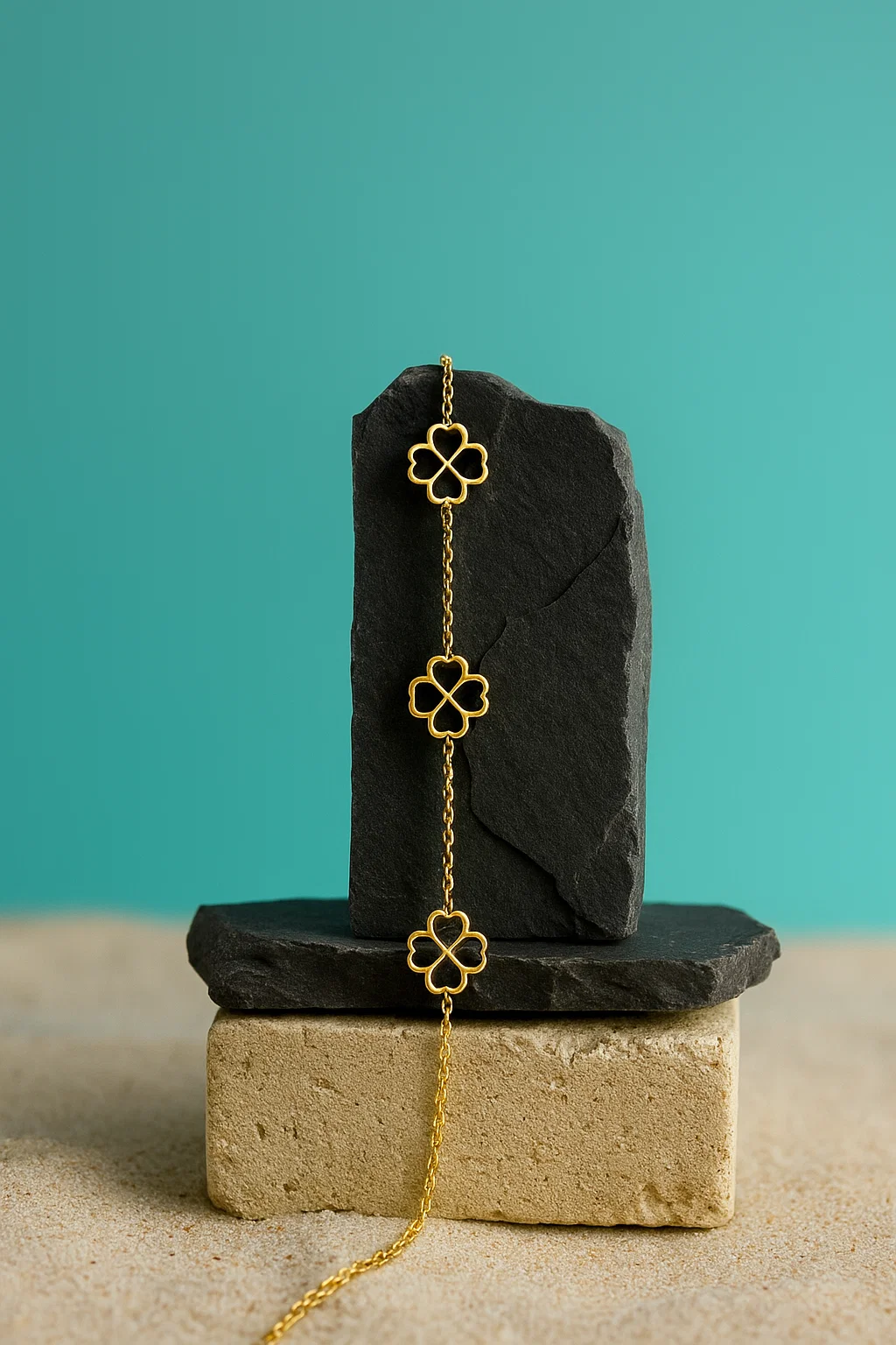 “هر گلبرگ این دستبند، قصه‌ای از عشق و خوش‌شانسی را در دل خود دارد… لمسش کن و جادوی لحظه‌ها را حس کن ✨🍀